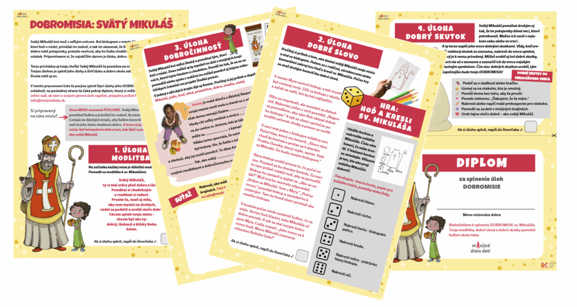Ich úlohou je byť misionármi dobra tam, kde žijú a pomáhať druhým ako svätý Mikuláš. Po zvládnutí všetkých úloh ich na poslednej strane čaká diplom, ktorý si môžu vyplniť a vystrihnúť.