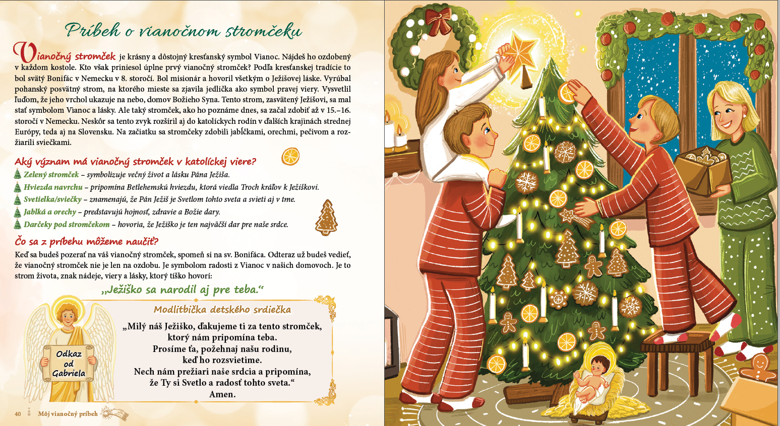 "Vďaka knižočke sa budú každý deň tešiť na Vianoce viac a viac. Všetky príbehy sú ladené v kresťanskom duchu, napísané detským jazykom, jednoducho a láskavo pre všetky detské srdiečka všetkých vekových kategórií. Hlavným hrdinom je archanjel Gabriel, ktorý sa stane ich priateľom a bude ich sprevádzať každou stranou tejto knižky a prerozpráva im skutočný príbeh Vianoc."